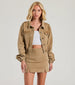 Layer on this cool bomber denim jacket for the ultimate trendsetting look! It features long sleeves with elasticized cuffs and a classic collar neckline. flap front pockets for loose items. and button-down closures leading to the cinched elasticized cropped hem. Complete the look with sunglasses for a road trip or travel!