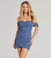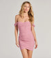 A dazzling glitter mini dress features an off-the-shoulder neckline. a flattering bodycon silhouette. and a wrap mini-length hem. Perfect for the school dance or a party.