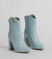 Add a touch of glitz in these rhinestone denim booties and get ready for the spotlight! Featuring a pointed-toe design and inner zipper closure. these booties are made with rhinestone-embellished denim material for a fun and stylish touch and have a comfortable block heel. Complete the look for a festival. concert. or country bar with a fun cowboy hat.