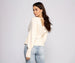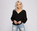 Get a cozy and casual look. perf for every day. in this adorable sweater! It features a wrap front and back. long blouson sleeves with ribbed hems. and a cute peplum hem. Pair this sweater with high rise jeans and gold hoop earrings.