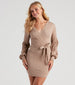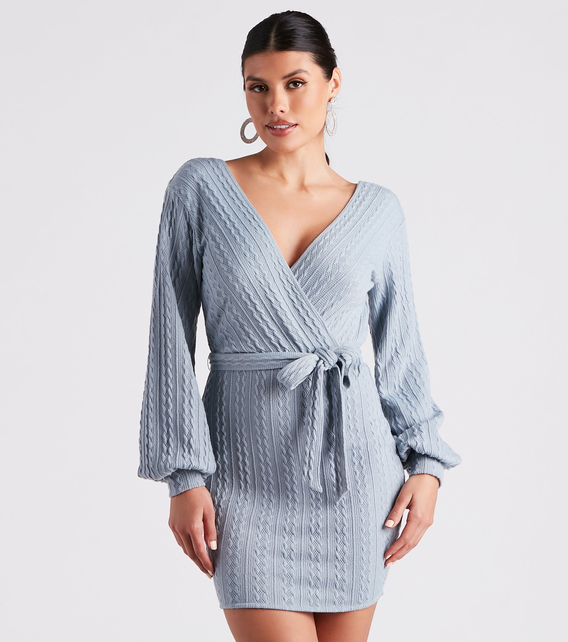Bring all the cozy vibes this season in this adorable cable knit mini dress! It features a V-neck and back with wrap designs. long balloon sleeves with tapered hems. a high waist with a tie-front accent. and a short. form-hugging fit. Style with knee-high boots.