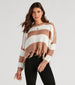 You'll be in a totally cozy mood in this adorable striped knit sweater! It features a crew neckline. long dolman-style sleeves. distressed detailing at the hems. and a mid-length. relaxed fit. The thick knit fabric has minimal stretch. Style with dark wash denim and ankle boots.