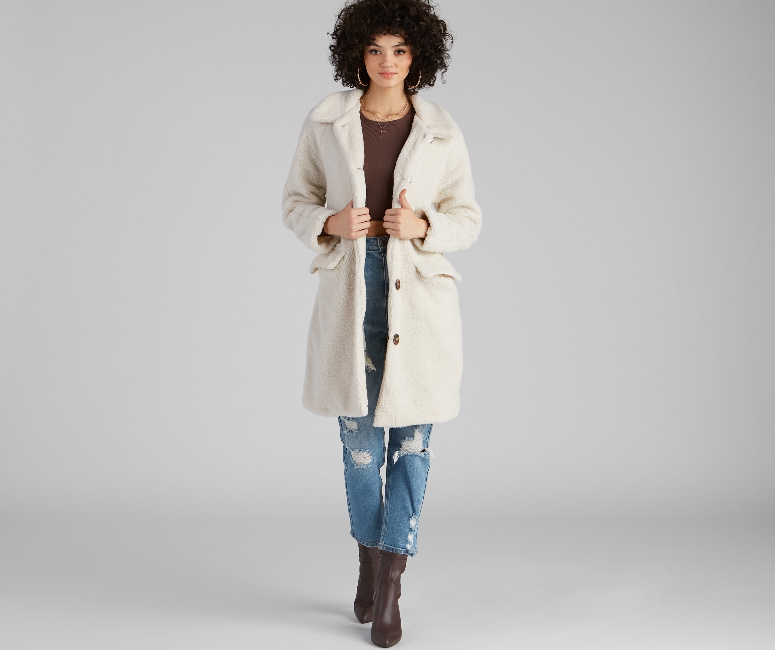'Tis the season to bundle up and stay cozy! This long faux sherpa coat features a collared neckline. long sleeves. a button-down front. and a relaxed and comfortable fit. Layer this adorable coat over your fave sweater dress and complete the look with knee-high boots.