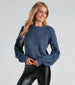 Cozy up in this adorable knit sweater for the autumn season! It features a crew neckline. long balloon sleeves with notched details. and a cropped. relaxed fit. Style with faux leather pants and combat boots.