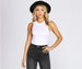 This sweet and simple bodysuit features a crew neckline. a sleeveless bodice that leads down to a thong bottom with a double snap closure. Bodysuit is composed of a nylon material that offers a form fit with moderate stretch. Pair with your fav high waisted denim!