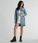 You'll be crushing the fashion scene in this denim trench! This jacket features long sleeves with button closures. a trendy collar neckline. and a flattering tie waist belt. With four pockets and a button-down front. you'll be both stylish and practical. Complete the look in booties.