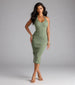 A sleeveless midi dress designed to highlight your curves featuring a flattering halter V-neckline. bodycon silhouette. and a flirty center back slit for movement. Complete the look with earrings and booties.