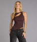Minimal but never boring—this rib knit tank top plays it chic with a twist boat neckline and subtle cutout at the bust. The asymmetrical hem with slit detail makes it the kind of piece you'll wear from coffee runs to casual dinner plans.