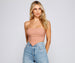 Showcase curves with a tube top that brings the style! The top features a sleeveless square neckline. a handkerchief-styled bodice. and a cropped hem. The top is composed of a ponte-like fabric that offers a form-hugging fit with a moderate stretch. Complete look with high waist jeans.