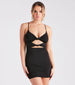 Cut to the chase and flaunt this sexy mini dress all over the club! It features a sleeveless V-neckline. spaghetti straps. dual knotted front designs with cutouts. and a form-hugging silhouette on slinky double-lined knit fabric. Complete the look in lace-up heels.