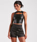 Going somewhere? This faux leather crop top will instantly elevate your look! It features a sleeveless crew neck. cutout bust. and a fitted silhouette. Style with sleek high-rise shorts for a concert!