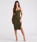 This ribbed knit midi dress is cute. casual. and perf for everyday styling! It features a sleeveless V-neckline. spaghetti straps. a midi-length hem with a side slit accent. and a form-hugging silhouette. The ribbed knit fabric offers plenty of stretch. Pair with a cropped denim jacket and strappy mules.
