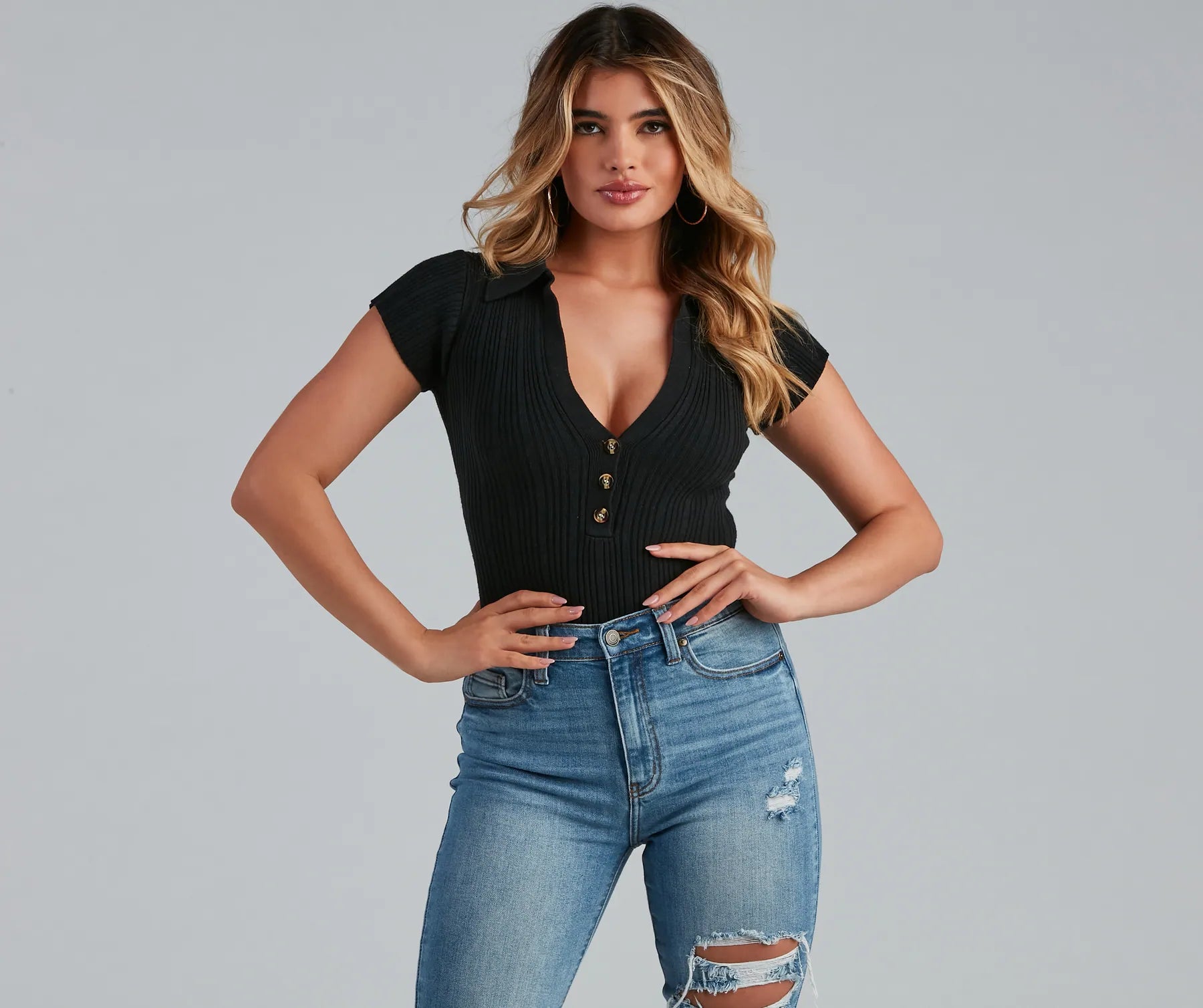 This cute and casual ribbed knit bodysuit is a must-have for trendy everyday 'fits! It features a johnny collar. a V-neckline with a partial button-down front. cap sleeves. a thong bottom. and a form-hugging fit. The ribbed sweater knit fabric offers plenty of stretch. Style with your fave pair of denim.