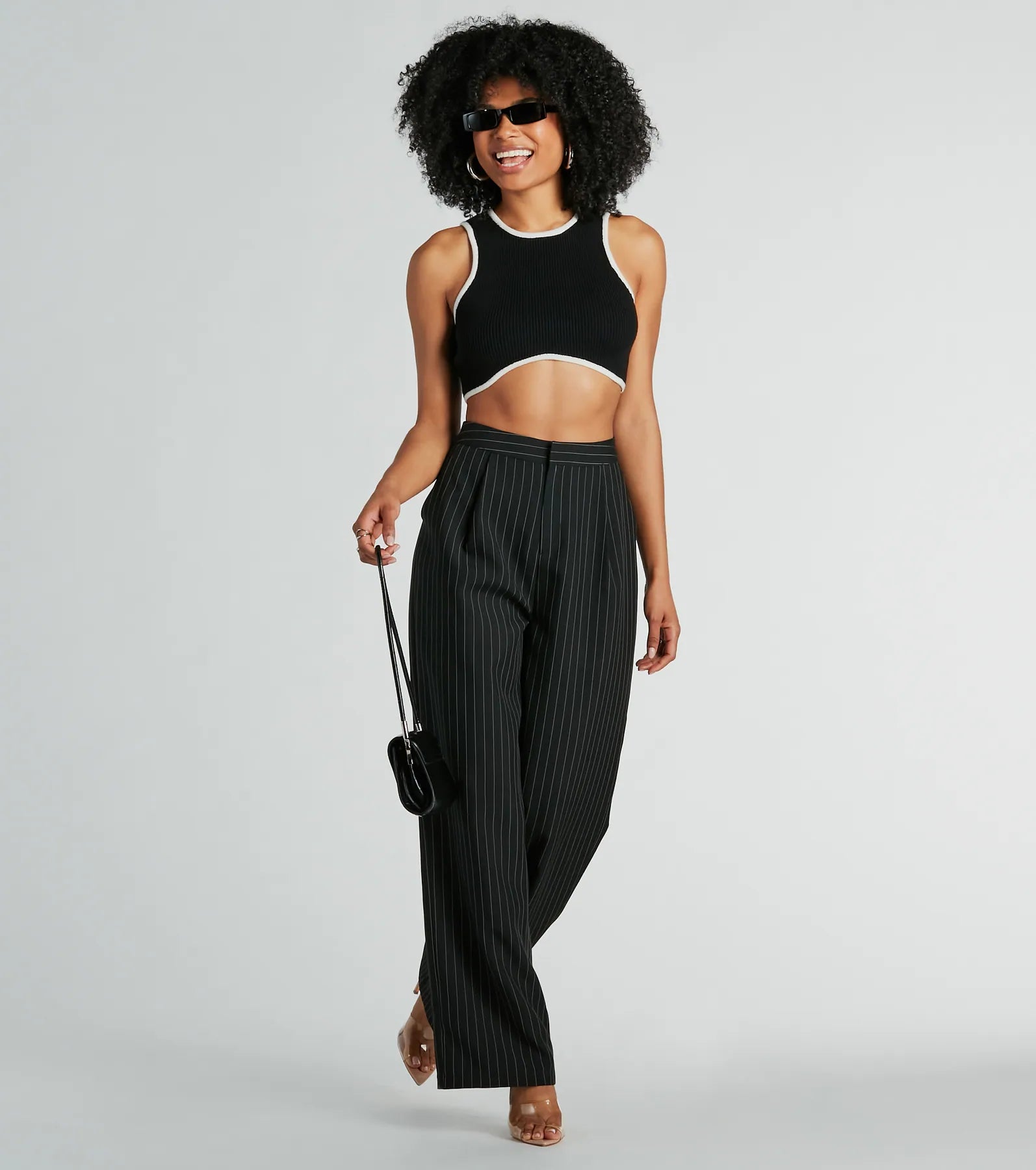 Give off a cute charm in this adorable sweater knit tank top! Made with soft and stretchy ribbed knit fabric. this crop top features a thin contrast seam design along the hems. The top is shaped with a sleeveless crew neckline and tank shoulder straps. and features a curved front hem for a trendy touch. Style with boyfriend jeans and mules!