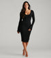 You'll be looking cute in the city in this casual midi dress perfect for a dinner date! It features bell long sleeves. a front and back V-neckline. and a flattering bodycon silhouette on rib knit fabric with a sewn-in knit lining. Complete the look with a chic crossbody bag.