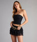 This ruffled lace mini skort is cutesy perfection for your summer outfits! Designed with a drop waist and tiered ruffled overlay. style with a crop top and cowboy boots.