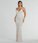 The exquisite details of the Cynthia lace up mermaid sequin formal dress are sure to have everyone in awe of you at prom. banquets. or red carpet events! Adorned with a stunning sequin scroll pattern on mesh fabric. this dress is the perfect choice for any formal occasion. She boasts a sultry V-neckline and spaghetti straps that form the lace-up back designed to turn heads and a mermaid silhouette that hugs your curves down to the floor-length hem. Complete the look with earrings and a bracelet.
