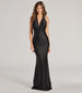Arrive in sleek perfection in the Dallas mermaid formal dress as a striking bridesmaid or wedding guest! The halter V-neckline with tie closure exudes elegance. while the open back with adjustable strap adds a touch of sensuality. The mermaid silhouette and floor-length hem create a stunning silhouette. all made with a smooth knit-lined fabric. Complete the look with rhinestone jewelry for sparkle!
