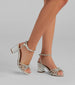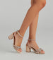 Put on your dancing shoes aka these gorgeous block heels for a night of twirling! They feature an open almond-shaped toe. a strappy rhinestone-embellished foot strap with a knot accent. a short block heel. an adjustable rhinestone trim ankle strap with a buckle closure. and a metallic sheen. Complete the look with a sparkly clutch purse for a dressy or formal soiree!