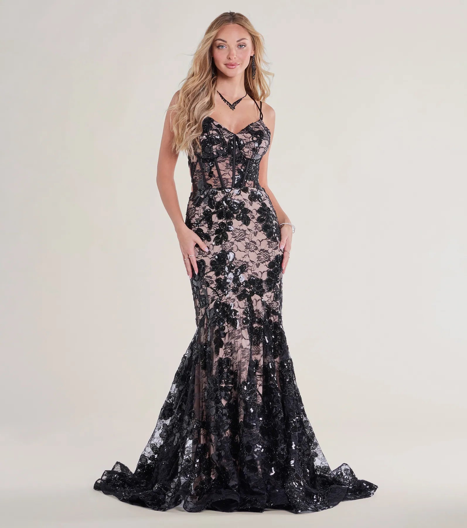 Your walk into the event or dance will be exceptionally glamorous in the Daniella lace sequin gown. Made from a beautiful lace sequin embellished fabric. this formal dress is designed to wow with a bustier bodice. lace-up back. and a stunning mermaid floor-length hem. Pair with a necklace.