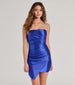 Dare to glam up the night in this glitter satin mini dress designed with a strapless straight neckline with an asymmetric pleated bodice. a pleated faux wrap-front design creating an asymmetric mini-length hem. and a bodycon silhouette to flaunt your curves. Style with a rhinestone jewelry set and metallic heels.