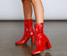 Showcase your diva-style with booties that slay. babe! The booties feature a mid-calf length. an inner zipper closure. a pointed toe. and a block heel. The booties are composed of a faux patent leather material. Complete look with a bustier and a mini skirt.Â