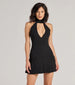 Dare to be bold in this sleeveless crepe mini dress designed with a striking keyhole cutout at the bust and a flattering A-line silhouette. Pair with earrings.