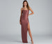 Keep it sophisticated and glam with the Darla formal dress that will elevate your look. Darla features a sleeveless cowl neckline. spaghetti straps. chic ruching at the bust. a high side slit to showcase some leg. and a curve-hugging A-line silhouette. The dress is composed of a satin-knit fabric that offers a moderate stretch. Complete the look with rhinestone heels.