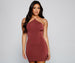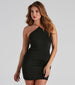 Look oh-so sleek with a dress that will have you date night ready! The dress features a sleeveless halter neck. sleek bungee spaghetti straps. and a form-hugging fit along the mini-length hem. Complete your dressy look with mules.