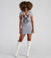 You gotta hustle girl! Work for your dreams while showcasing your edgy style in this tunic top featuring short sleeves. a V-notch neckline. and graphic front detail with side drawstring cutouts and a fitted hem. Complete the look in retro boots.