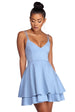 Get ready for a fab daytime affair in this light blue skater dress! It features a fitted bodice with a deep V neckline. double shoulder straps that cross at the back. princess seams. and a high waist seam leading to a flowy skirt with a double layer hem. Dress is composed of a ponte knit fabric with a moderate stretch.
