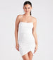Step out looking decadent in this crepe mini dress as the chic bride-to-be or cocktail party guest! It features a sleeveless square neck. spaghetti straps that lace up along the back. a center front ruched seam. and a bodycon silhouette. The dress is designed with all-over faux pearl embellishments on stretchy crepe fabric. Complete the look in sleek stiletto heels.