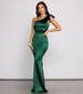 Keep it luxe in the stunning Delana dress that brings the sophistication to your special evening. She features a unique one-shoulder neckline with a charming bow accent on the left shoulder. a floor-length mermaid silhouette. and is composed of a captivating satin-like fabric. Complete your special occasion outfit with rhinestone earrings.