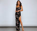Bring the romance with a floral dress that brings the charm! Delaney features a floral print. a sleeveless cowl neckline. spaghetti straps. an A-line silhouette. and a high side slit. The dress is composed of a lined mesh fabric that offers a form hugging fit with a moderate stretch. Complete look with block heels and a butterfly necklace.Â