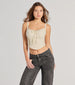 Level up your look with this lace trim corset top. Featuring a lace scoop neckline. adjustable straps. and a smocked back. it's all about those dreamy details.
