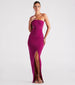 Chic with a sultry style. the Demi formal dress will level up your look for weddings. parties. or any fancy affair. She features a sleeveless asymmetric one-shoulder neckline. a thin tank shoulder strap. a high waist seam. ruched detailing down one side seam. a floor-length hem with a wrap-front design creating a sexy thigh-high slit. and a curve-hugging silhouette. Style with rhinestone fringe earrings and metallic heels.