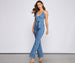Showcase your fashion diva side in this fab denim jumpsuit! It features a sleeveless V-neckline with a wrap-front design. halter spaghetti straps. a high waist with a tie-front belt. a form-hugging silhouette. and pant legs with a flared hem. Style this jumpsuit with clear heels.