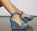 You'll be a total denim diva in these trendy wedges! They feature an open almond toe. a frayed detail toe strap. a frayed ankle strap with an adjustable buckle. and a platform wedge heel. Pair these wedges with a casual dress for a brunch ready look.
