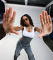 Denim but make it daring—this strapless corset top stuns with grommet trim. structured seams. and a lace-up back that's all edge. Pair it with leather shorts and layered jewelry for that downtown it-girl vibe.