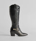 These faux leather boots feature a western-inspired buckle and an under-the-knee length perfect for styling with your favorite denim.