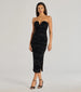 Stroll into the party in the Destiny formal midi dress to make a striking impression! The formal dress showcases a sultry strapless sweetheart neckline and a ruched bodycon fit that accentuates your figure. Complete the look with earrings and heels.