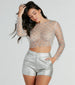The details of this mesh crop top will have everyone complimenting on your next night out! Crafted from a sheer mesh fabric. this top features fitted long sleeves and a crew neckline. adorned with a stunning faux pearl and rhinestone pattern. The cropped hem adds a touch of modern style while flattering your figure! Style this crop top with hot faux leather shorts and heels for a striking look!