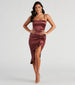 This satin midi dress will have you looking so lavish and capturing all the attention at a dinner party or cocktail hour! It features a sleek sleeveless square neckline. spaghetti straps. a form-fitting silhouette. and an asymmetric midi-length hem creating a high front slit with a ruffled trim. The luxe satin fabric offers a moderate stretch. Complete the look with an elegant hairpiece for a classy updo.