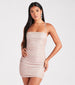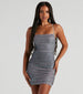 Give off glimmering disco ball vibes in this stunning glitter knit mini dress! The short dress features a sleeveless square neckline. thin rhinestone embellished straps. a cross-back strap design. ruching down the side seams. and a short. curve-hugging silhouette. The glitter knit fabric showcases a gorgeous iridescent sheen. Style with clear heels.