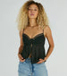 Stand out looking darling in this chiffon crop top for some sultriness! Featuring a lace trim sweetheart neckline. adjustable spaghetti straps. and a button front closure. this top allows for a customizable and chic fit. The center split design and cropped hem add a playful touch to any outfit. Complete the look in sleek faux leather pants.