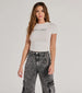 This trendy graphic tee features a crew neckline. short sleeves. a cursive script reading "Do Not Disturb." and a fitted cropped hem. Perf for a laidback weekend. style with jeans and sneakers.