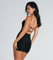 You plus this mini dress equals a good time! The short dress features a square neckline. velvet spaghetti straps. an open strappy back design. a flattering bodycon silhouette. and a mini-length hem on mesh fabric showcasing a velvet burnout geometric pattern. Complete the look with earrings and lace-up heels for a night out.