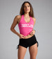 Serve icon attitude in this trendy graphic top featuring a halter V-neck. fitted cropped hem. and script reading. "Don't Be Jealous." Style with distressed denim and sneakers.