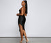 Make them take a double-take with a midi dress that stuns! The dress features a sleeveless square neckline. bungee spaghetti straps. a strappy bar strap back. and a midi-length silhouette with an asymmetrical hem. The dress is composed of a smooth knit fabric that offers a form-hugging fit with a moderate stretch. Complete look with rhinestone heels.Â