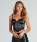 A satin corset top worthy of double takes! It features a sweetheart neckline with applique trim. adjustable spaghetti straps. and underwire bust for support. The flexible boning helps to flaunt your figure while the curved cropped hem showcases a unique applique trim. Style with the matching mini skirt to complete the look for a date or birthday dinner!